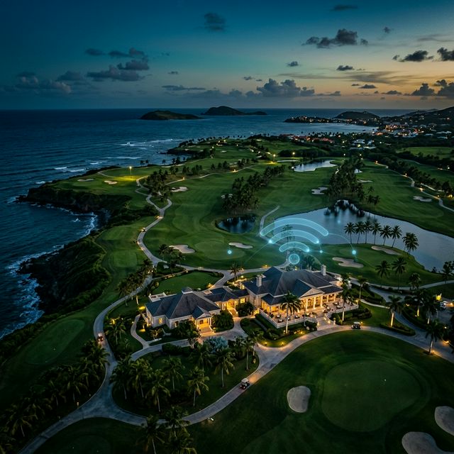 WiFi fluido en fairways y amenidades, control de acceso VIP en clubhouse, cámaras 4K en el recorrido y señalización digital en torneos y eventos privados.