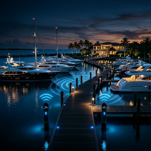WiFi de largo alcance sobre muelles, control de acceso por finger y dock, cámaras 4K anti-corrosión marina y señalización de condiciones en tiempo real.
